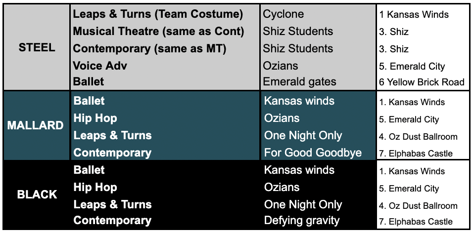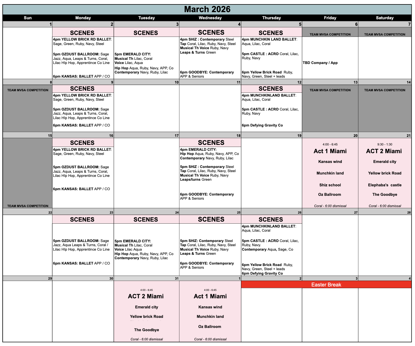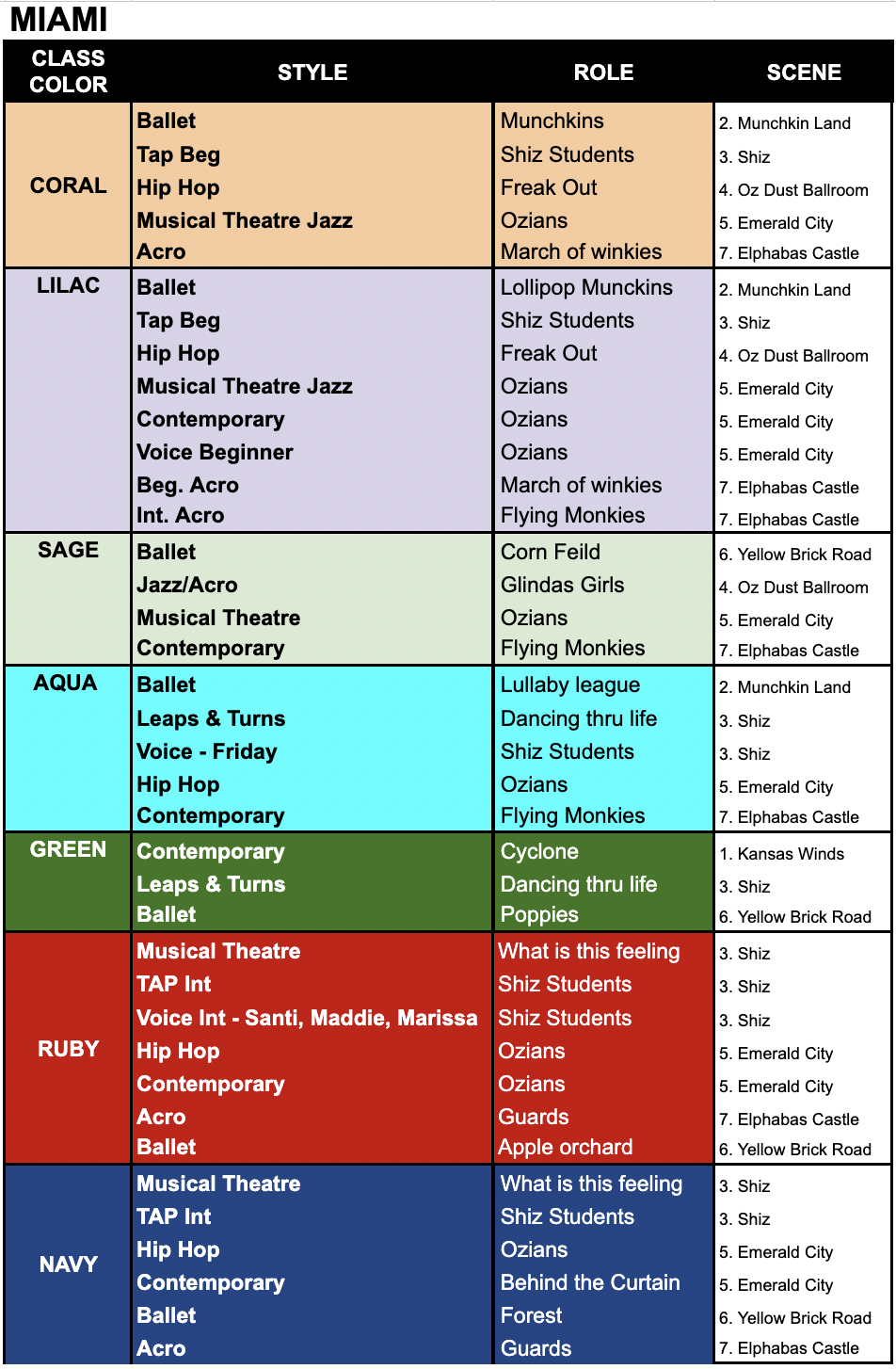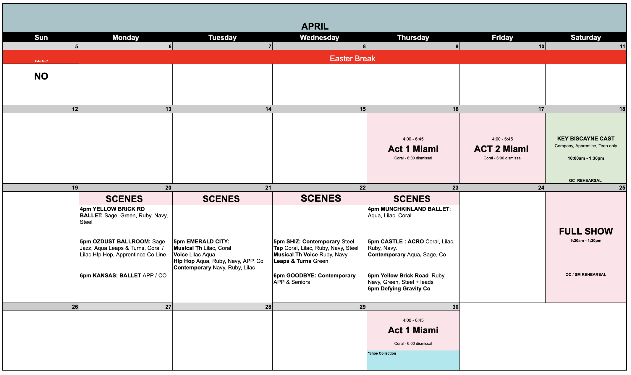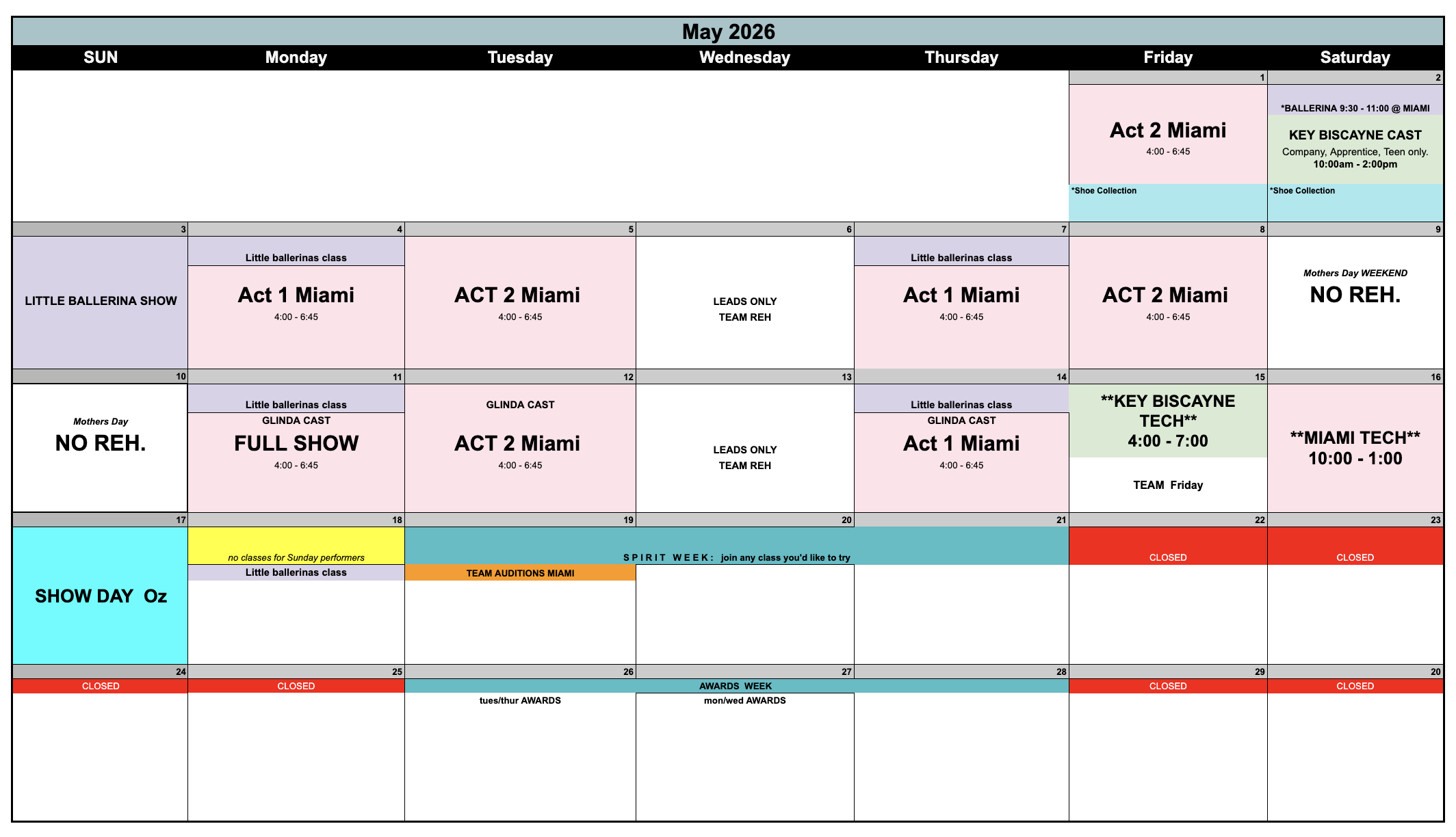 Students will need to arrive 2 hours prior to showtime - performance ready, with hair and make-up done.